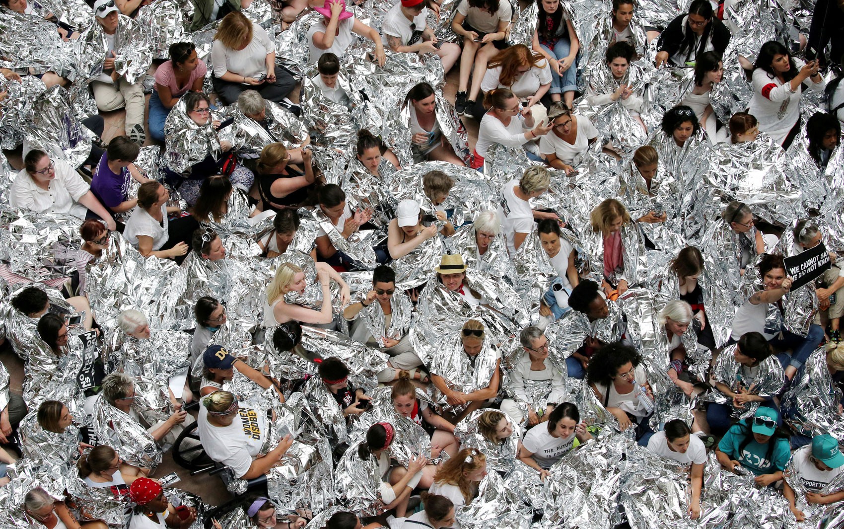 Em sua maioria mulheres, manifestantes se enrolaram em cobertores prateados e gritaram que imigrantes são bem-vindos, antes de serem detido...