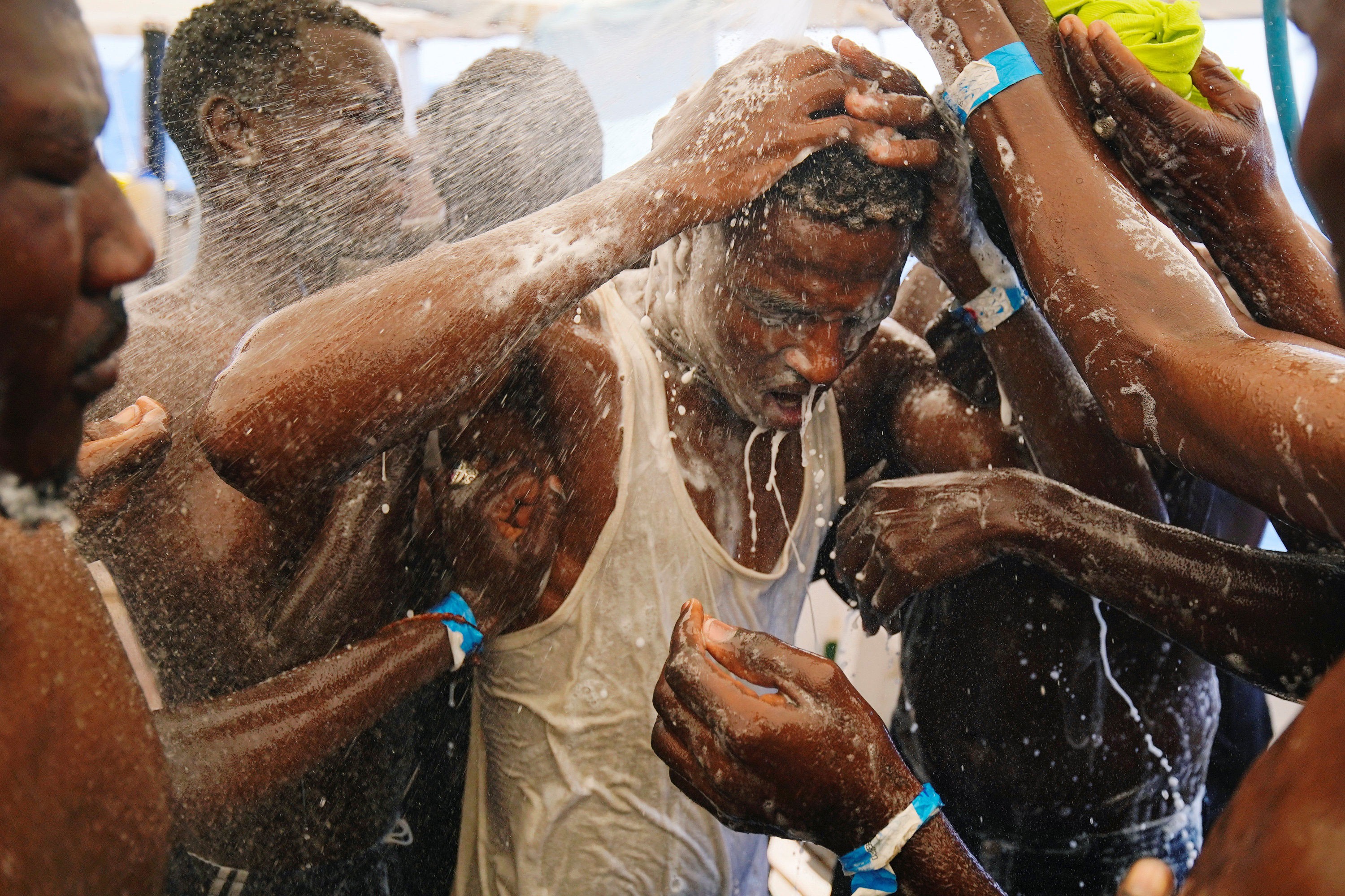 Imigrantes foram resgatados na quarta-feira em águas internacionais frente à Líbia. Imigrantes tomam banho nesta sexta (3) no barco da ONG ...