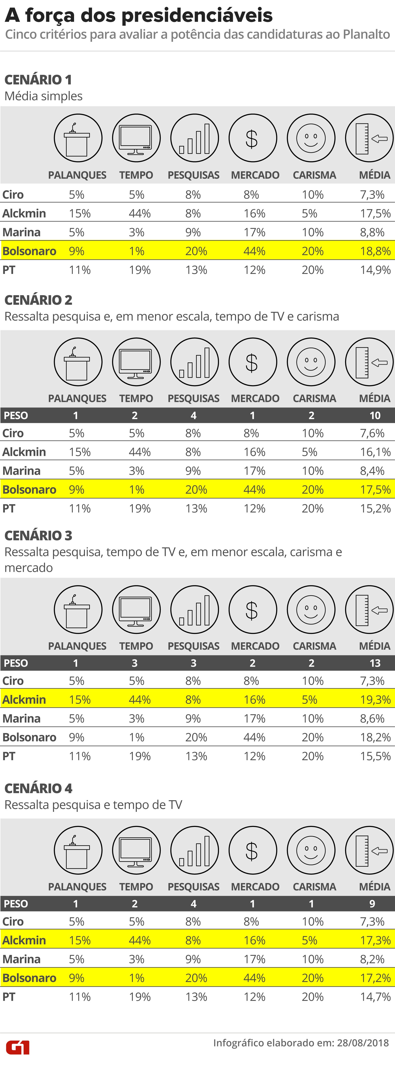 Cinco critérios para medir as chances dos candidatos hoje (até a eleição, tudo pode mudar...) O quadro eleitoral permanece nebuloso. Mas a definição das alianças regionais e do tempo no horário gratuito no rádio e na TV permite medir com maior grau de fidelidade a força de cada candidatura à Presidência, de acordo com o método que sugeri em post no final de abril. A avliação se restringiu às cinco candidaturas com desempenho melhor nas pesquisas: Jair Bolsonaro (PSL), Marina Silva (Rede), Ciro Gomes (PDT), Geraldo Alckmin (PSDB) e o candidato petista. Como a candidatura do ex-presidente Luiz Inácio Lula da Silva deverá ser indeferida pelo Tribunal Superior Eleitoral (TSE), a análise leva em conta o cenário mais provável, com o ex-prefeito paulistano Fernando Haddad. Quem acredita que Lula será candidato pode refazer as contas com os números relativos a ele. O cálculo está baseado em cinco fatores: desempenho nas pesquisas, tempo de televisão, palanques regionais, avaliação pelo mercado financeiro e carisma. Os quatro primeiros são medidos de modo objetivo, a avaliação do último é subjetiva, guarda espaço para fatores imponderáveis que podem ganhar relevo ao longo da disputa. Como toda leitura parcial da realidade, é um método sujeito a limitações, analisadas abaixo. Por isso mesmo, não configura uma previsão, muito menos atribuição de probabilidades. Trata-se apenas de uma tentativa de conferir algum grau de objetividade ao cenário confuso. Ganha-se mais informação sobre a realidade eleitoral incluindo na avaliação outros fatores além das pesquisas. A análise, é importante lembrar, se refere ao presente e está baseada nos últimos números disponíveis para cada critério. Todos eles flutuam ao longo do tempo, portanto os resultados também são dinâmicos. O princípio essencial continua o mesmo: a eleição é um jogo de soma zero, em que o ganho de um implica a perda de outro (ninguém pode votar em dois candidatos). Cada fator pode, portanto, ser medido de acordo com percentuais. Quando um sobe, outro desce. Também é possível calcular médias ponderadas, de acordo com a relevância atribuída a cada fator. Esse tipo de decisão pode favorecer um ou outro candidato, como mostram as tabelas no final do texto. A ideia é que cada um faça as contas de acordo com sua própria opinião, de modo a perceber onde cada candidato concentra sua força. Eis os critérios adotados (e suas limitações): Pesquisas – Mesmo que não traduzam toda a realidade, são a forma mais precisa de medir o sentimento do eleitor. Nas tabelas, adotei o resultado da última pesquisa XP/Ipespe, divulgada na sexta-feira passada. Fiz essa opção por dois motivos: 1) a XP tem consistentemente avaliado o cenário mais provável, em que Haddad concorre, apresentado como o “candidato do Lula”; 2) os resultados da última rodada se aproximam da média das pesquisas no modelo do site Polling Data, mantido pelo estatístico Neale El-Dash (e também com os cenários formulados por ele para a pesquisa mais recente do Instituto FSB e com os dados de Ibope e Datafolha), portanto são consistentes com a realidade. Quem discordar pode se sentir livre para substituir os números por outros. A metodologia é mais relevante que o resultado. Tempo de TV – Os tempos oficiais destinados a cada candidato foram definidos pelo TSE. Basta, portanto, atribuir a cada um o percentual do tempo total. Importante lembrar que o horário eleitoral gratuito influiu no resultado de todas as últimas eleições. Com um alto percentual de votos indefinidos (mais da metade), também poderá ser decisivo nesta. Alianças regionais – Os palanques de cada candidato nos estados estão definidos. A equipe do G1, coordenada por Vitor Sorano, levantou o apoio dos 198 candidatos a governador oficialmente registrados no TSE a cada presidenciável (o resultado foi publicado numa série de quadros elaborados pelo infografista Alexandre Mauro). Para calcular a potência regional de cada candidatura, considerei o apoio a cada um entre todos os palanques estaduais. Se reúne quatro apoios entre dez candidatos a governador, terá uma força equivalente a 40% naquele estado. O resultado nacional é calculado ponderando essa força pelo eleitorado de cada unidade federativa. O critério padece de uma deficiência óbvia: como está baseado nas candidaturas oficiais no TSE, não considera as traições. O número do tucano Geraldo Alckmin pode estar um pouco superestimado por causa disso. Mesmo assim, entre quase 200 candidaturas a governador, não parece haver um número suficiente de traições que alterem o resultado de modo significativo – e elas também funcionam em todas as direções. Mercado – A aposta do mercado financeiro, formado por profissionais especializados em apostas, costuma ser um sinal relevante para entender as chances de cada um. Ninguém se elege no Brasil sem acenos à eleite econômica, embora ela não eleja ninguém por si só. O critério adotado é o percentual de menções nos segundos turnos na última sondagem realizada pela XP Investimentos com 146 representantes de instituições financeiras. Como o resultado é do início de julho (último prazo autorizado pelo TSE), esse indicador está defasado. Mas é uma aposta e, por definição, tenta antecipar a tendência, portanto ainda pode ser levada em conta. Carisma – Fiz uma avaliação simples, subjetiva, dos fatores emocionais associados a cada candidatura. Para simplificar, criei apenas três patamares: carisma alto (candidaturas do PT e de Bolsonaro), médio (Ciro e Marina) e baixo (Geraldo). Depois distribuí em percentuais que representam a força de cada um nesse quesito. As tabelas a seguir apresentam quatro cenários. Numa média simples, a candidatura de Bolsonaro se destaca. Dando maior peso às pesquisas e, em menor grau, a tempo de TV e carisma, ele ainda demonstra mais força. Quando o tempo de TV ganha 